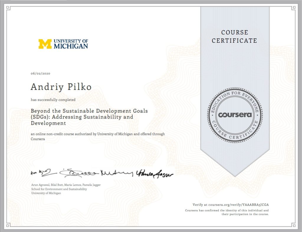 Сертифікати про проходження курсу на платформі Coursera. К.е.н., доцент кафедри економічної кібернетики Пілько Андрій Дмитрович успішно пройшов курси та отримав наступні сертифікати: