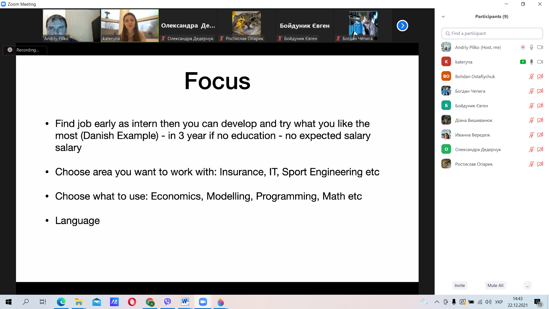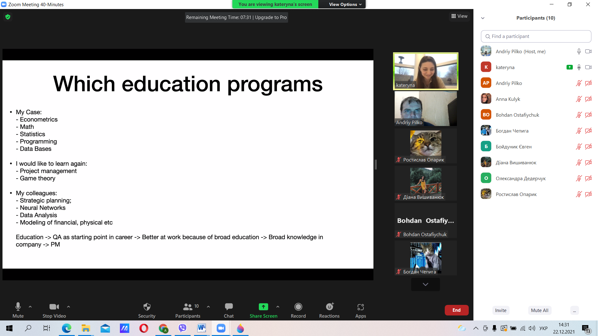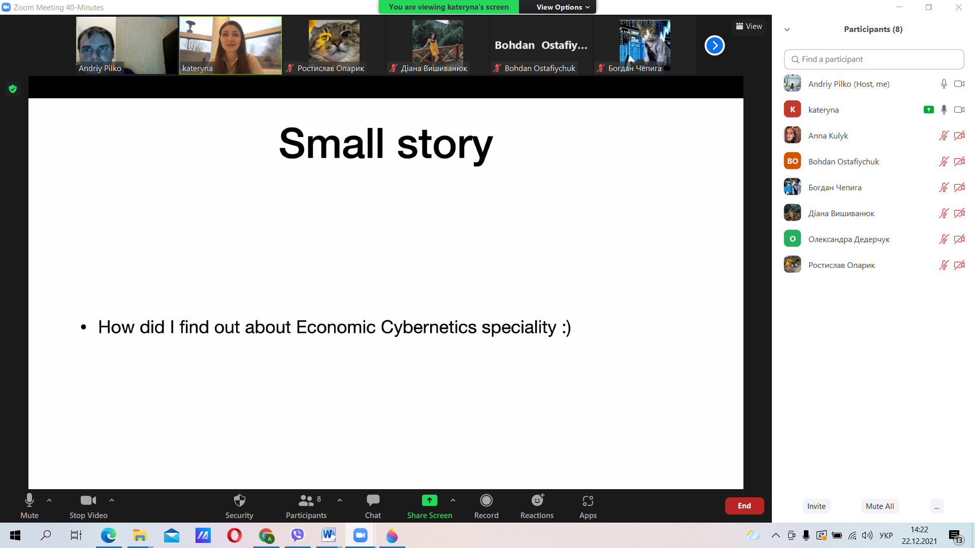 В рамках реалізації корпоративного соціального проєкту «Осередок менторства», який започатковано в Прикарпатському національному університеті імені Василя Стефаника, 22 грудня 2021 року відбулась онлайн-зустріч студентів економічного факультету, а також потенційних абітурієнтів з Катериною Крицун, випускницею кафедри економічної кібернетики 2011 року, Ph.D. in Economics, Senior QA Engineer, Team Lead at TrackMan (Данія).