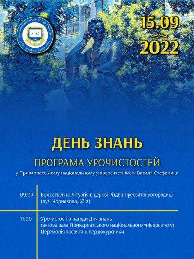 15 вересня у Прикарпатському національному університеті відбудуться урочисті заходи з нагоди Посвяти першокурсників у студенти та початку навчального року. Щодо організаційних питань та участі у заходах першокурсників просимо звертатися в деканати факультетів та інститутів університету. Усіх охочих, зокрема, батьків першокурсників, Читати далі