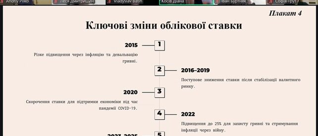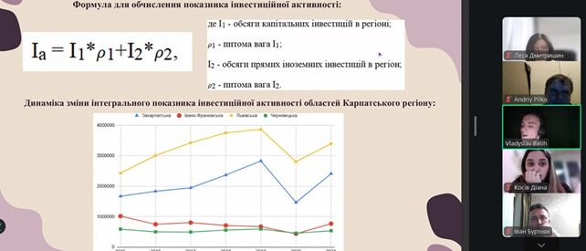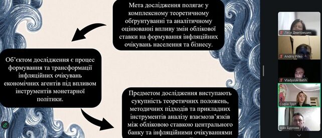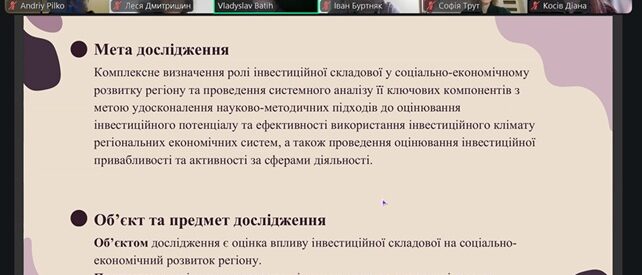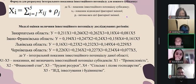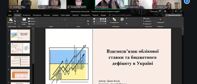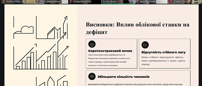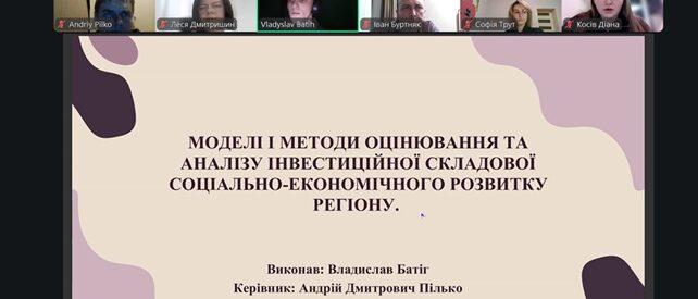 6 лютого 2026 року відбувся захист студентських наукових робіт в рамках І етапу Всеукраїнського конкурсу студентських наукових робіт зі спеціальності Економічна кібернетика. Цьогоріч учасниками конкурсу стали: студентка 2 курсу спеціальності «Економіка» Софія-Діана ТРУТ з науковою роботою на тему «Вплив зміни облікової ставки на інфляційні очікування населення та бізнесу», науковий керівник – к.е.н., доцент кафедри економічної кібернетики Андрій ПІЛЬКО, студентка 3 курсу спеціальності «Економіка» Діана КОСІВ, яка представила наукову роботу на тему «Взаємозв’язок облікової ставки та бюджетного дефіциту в Україні», науковий керівник – к.е.н., доцент кафедри економічної кібернетики Андрій ПІЛЬКО та студент 3 курсу спеціальності «Економіка» Владислав БАТІГ, який представив наукову роботу на тему «Моделі і методи оцінювання та аналізу інвестиційної складової соціально-економічного розвитку регіону», науковий керівник – к.е.н., доцент кафедри економічної кібернетики Андрій ПІЛЬКО.