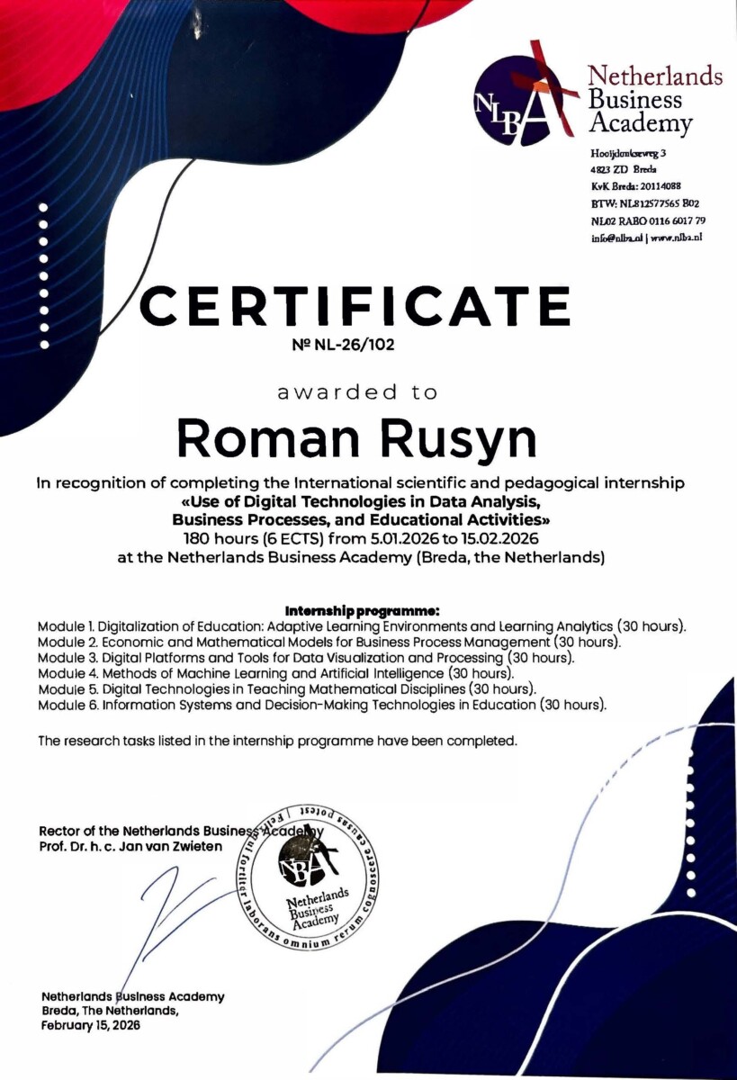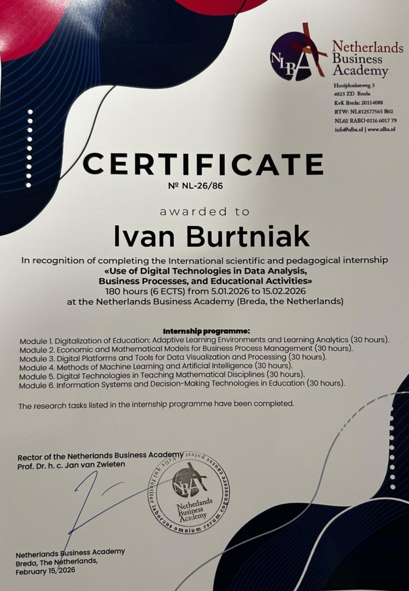 Вітаємо з успішним завершенням міжнародного стажування д.е.н., професора, професора кафедри економічної кібернетика Івана БУРТНЯКА та к.е.н., доцента, доцента кафедри економічної кібернетика Романа РУСИНА!