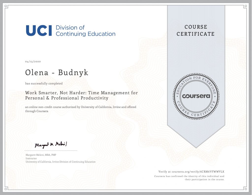 Сертифікат про проходження курсу на платформі Coursera. К.е.н., доцент кафедри економічної кібернетики Судук Наталія Василівна отримала сертифікат за програмою Excel Skills for Business: Essentials (Macquarie University, Sydney, Australia).